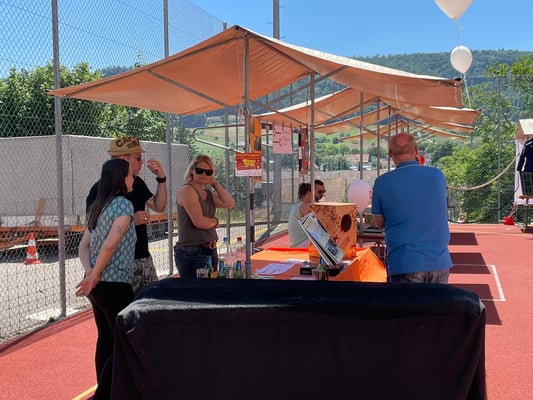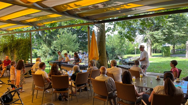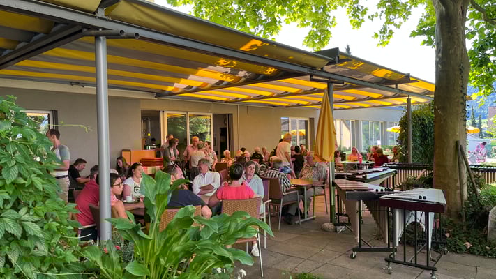 In diesem Jahr messen sich die Teilnehmer:innen in einer Olympiade in verschieden Geschicklichkeitsspielen. Da geht es um musikalisches Grundwissen, aber auch um andere Fähigkeiten, wie zum Beispiel im Team „hochzustapeln“. Welche Gruppe wohl diesen Wettbewerb für sich entscheidet? Die Auswertung erfolgt dann am bunten Abend und ist eines der vielen Highlights des Abends. Die ganze Woche wurden wir kulinarisch von Gerry und Martin verwöhnt. So einige werden wir wohl neben schönen Erinnerungen auch ein oder zwei Pfund mehr nach Hause nehmen. Zum Abschluss des Lagers dürfen wir allen angereisten Eltern und Familien unsere Fortschritte präsentieren. In einem Konzert im ref. Kirchenzentrum in Gstaad lassen wir alle Interessierten musikalisch an unserer Lagerwoche teilhaben.