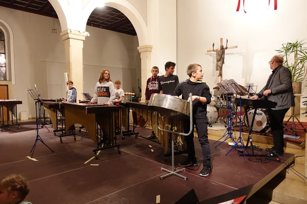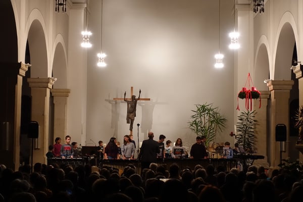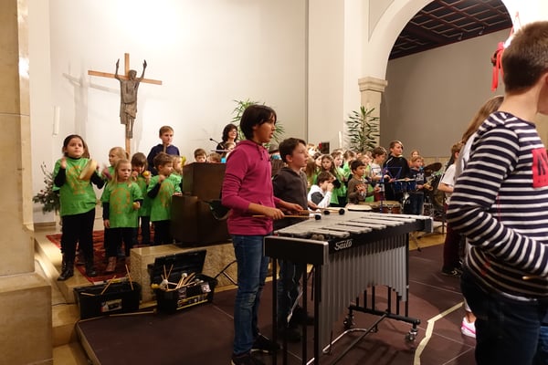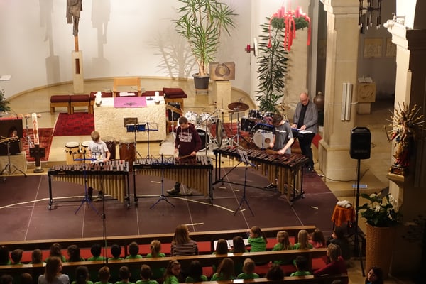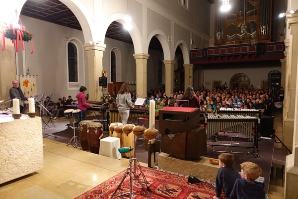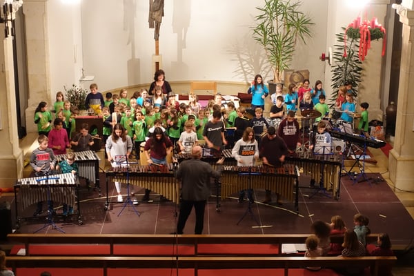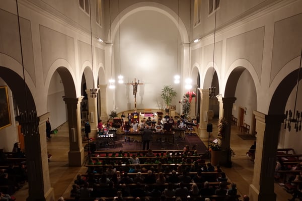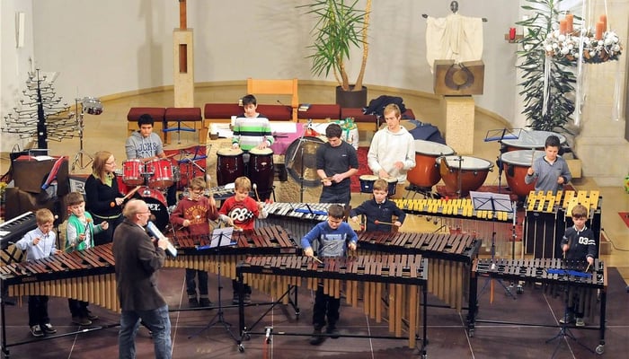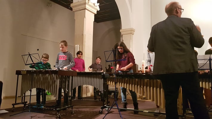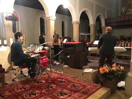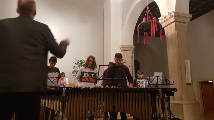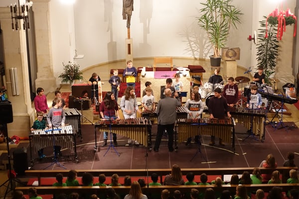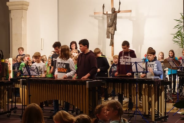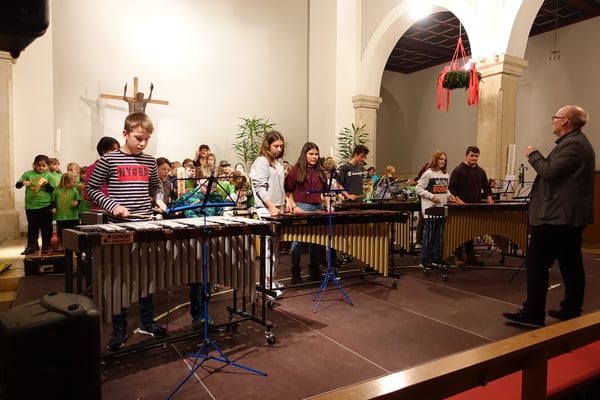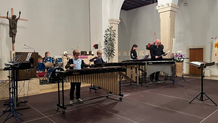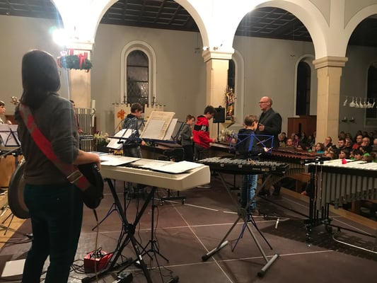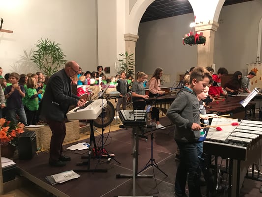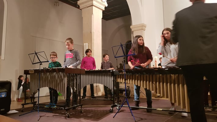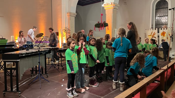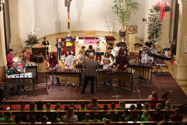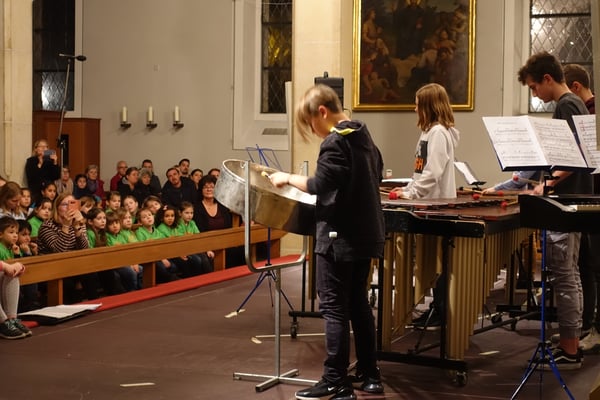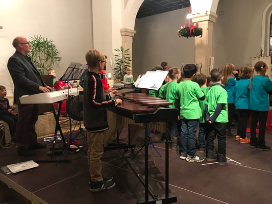 Kurz vor 17.00 Uhr. Die Nervosität steigt. «Ich finde meine Schlagzeugstöcke nicht», «Wer hat mein Notenblatt?», «Ich muss dringend noch auf’s Klo» oder «Darf ich noch kurz etwas trinken?» Es geht los! Die Galluskirche in Wangen b. Olten ist bis auf den letzten Platz gefüllt, es knistert in der Luft. Mit dem Jazz Standard «JADA» eröffnen jüngere Schüler der Orffgruppen Wangen bei Olten unter der Leitung von Walter Grob das Konzert. Das Programm ist vielseitig. So wird beispielsweise im ersten Teil neben «Jingle Bells» auch das klassische Werk «18th Century Theme» von Mozart mit der Solistin Aurélie Wagner aufgeführt.