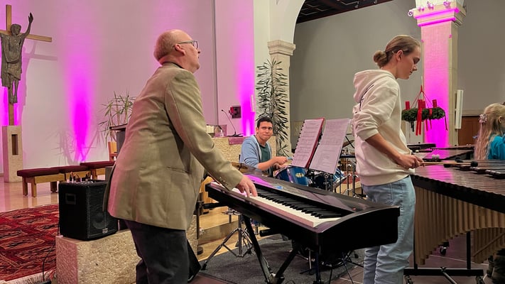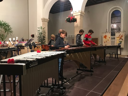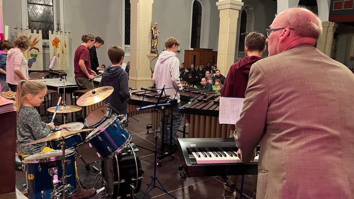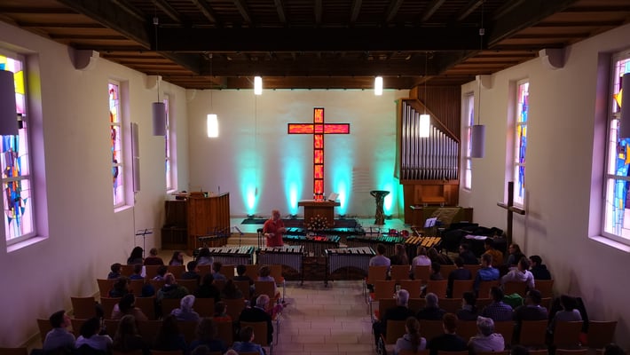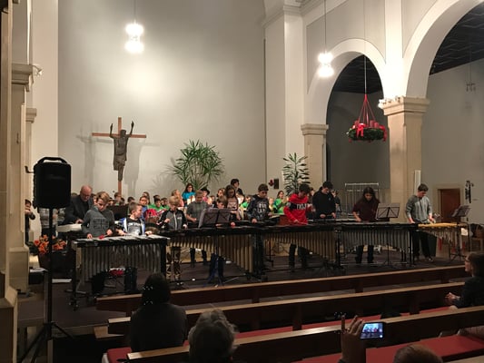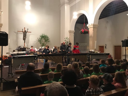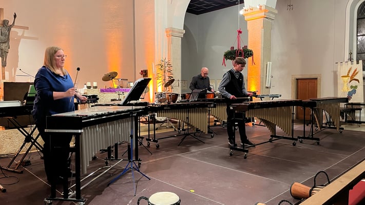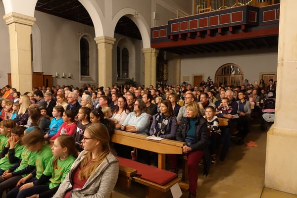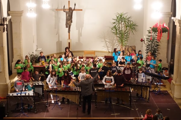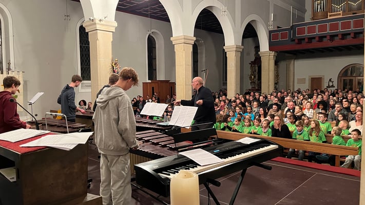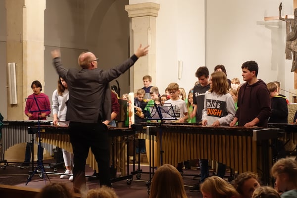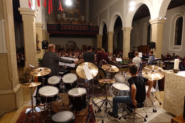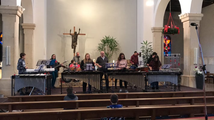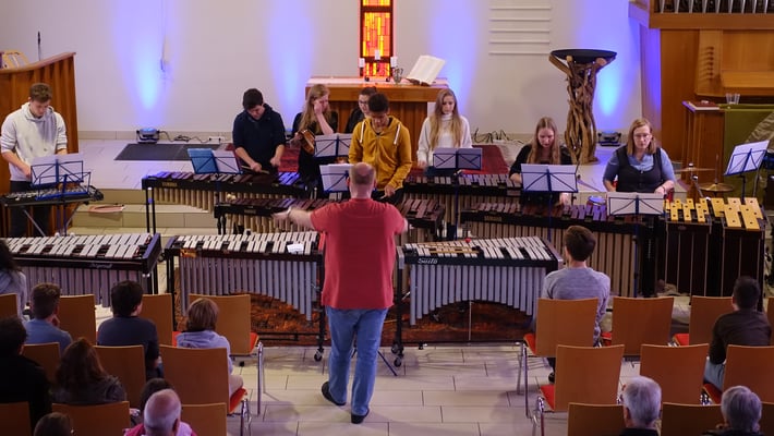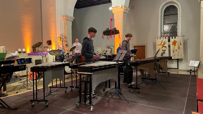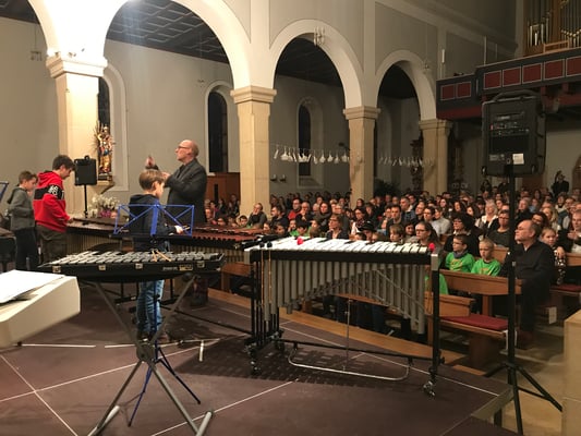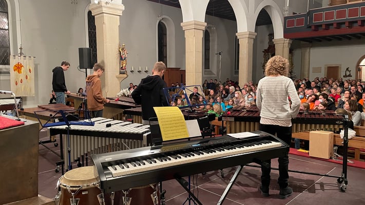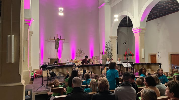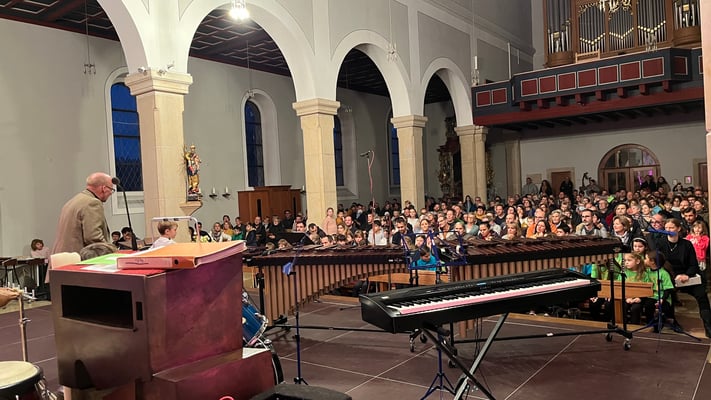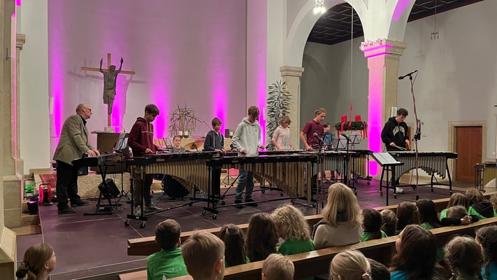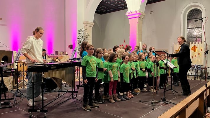 Kurz vor 17.00 Uhr. Die Nervosität steigt. «Ich finde meine Schlagzeugstöcke nicht», «Wer hat mein Notenblatt?», «Ich muss dringend noch auf’s Klo» oder «Darf ich noch kurz etwas trinken?» Es geht los! Die Galluskirche in Wangen b. Olten ist bis auf den letzten Platz gefüllt, es knistert in der Luft. Mit dem Jazz Standard «JADA» eröffnen jüngere Schüler der Orffgruppen Wangen bei Olten unter der Leitung von Walter Grob das Konzert. Das Programm ist vielseitig. So wird beispielsweise im ersten Teil neben «Jingle Bells» auch das klassische Werk «18th Century Theme» von Mozart mit der Solistin Aurélie Wagner aufgeführt.