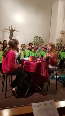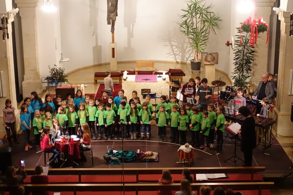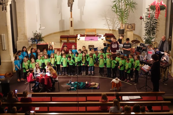 Kurz vor 17.00 Uhr ist die Galluskirche in Wangen b. Olten bis auf den letzten Platz gefüllt, es knistert in der Luft. Über 70 Kinder und Jugendliche freuen sich auf den Auftritt, die Nervosität steigt. Mit dem traditionellen «Jingle Bells» eröffnen jüngere Schüler der Orffgruppen Wangen bei Olten unter der Leitung von Walter Grob das Konzert. Das Programm ist vielseitig. So werden neben weihnachtlichen Liedern auch Stücke wie «Can Can» von Jacques Offenbach aufgeführt. Plötzlich wird auf der Bühne Sterntalersuppe gekocht. So wird das Musical «Sterntaler» eingeleitet, welches nach den Gebrüdern Grimm komponiert von Uli Führe, von den Wangner Spatzen und dem popCHORn unter der Leitung von Christina Lerch souverän aufgeführt wird. Die musikalische Begleitung dazu übernimmt eine Orffgruppe. Die Kinder strahlen Freude aus und präsentieren stolz und gekonnt, was sie in den letzten Wochen geübt oder im Herbstlager fleissig erarbeitet haben. Lauter Applaus erntet auch die Solistin Aurélie Wagner für das anspruchsvolle Stück «Csárdás» des italienischen Komponisten Vittorio Monti. Das nächste Highlight folgt beim aktuellen Song «when the beat drops out» von Marlon Roudette, bei welchem zusätzlich die Steel Pan, auch Steel Drum genannt, auf die Bühne geholt werden.